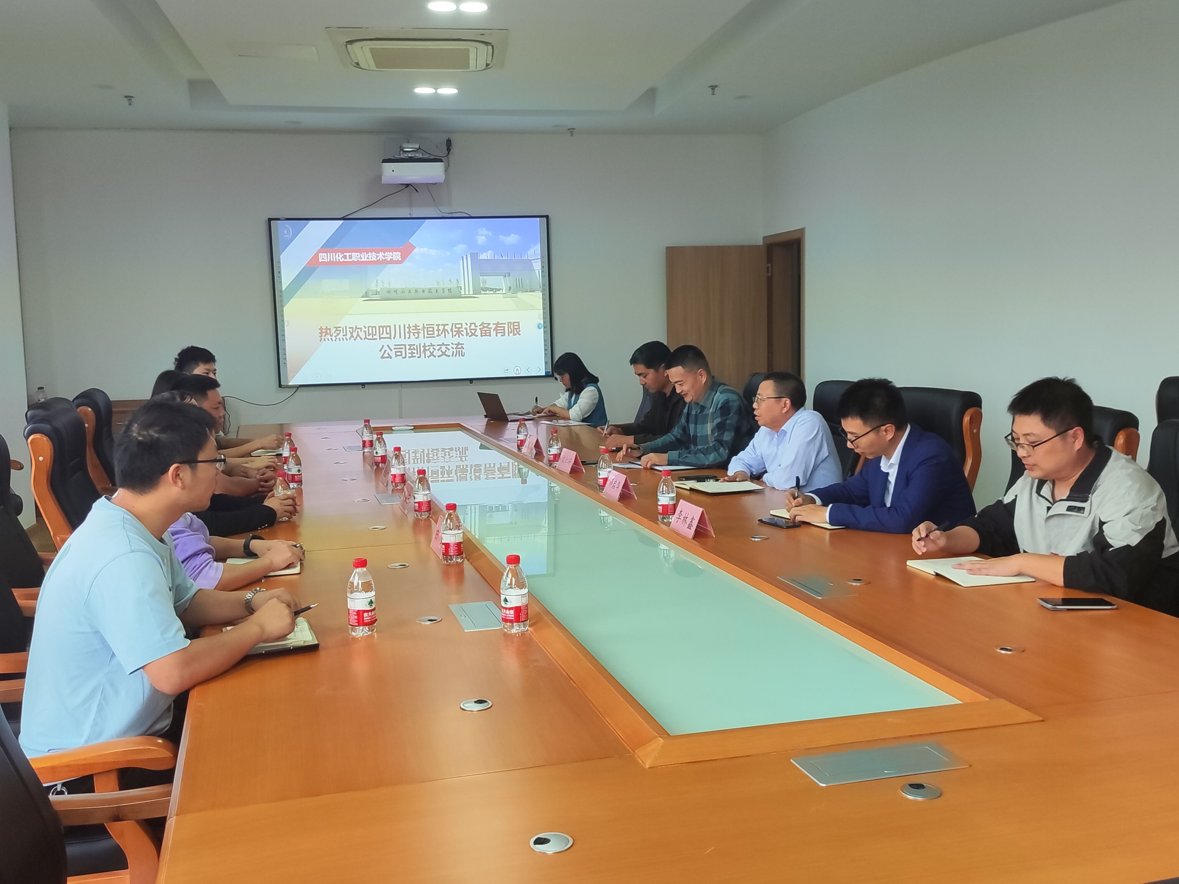 9月26日,四川持恒环保设备有限公司技术总监阎小宁一行来校洽谈生活用水处理厂智能化改造项目,并在综合办公楼221会议室召开合作交流座谈会。学校党委委员、副院长邓启华,智能制造学院院长李林鑫参加座谈会,座谈会由科技处副处长文仁兴主持。
